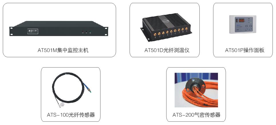 本系統由 AT501D光纖測溫儀、ATS-100(ATS-200)光纖傳感器、AT501P操作面板、AT501M集中監控主機和系統管理軟件等部分組成。