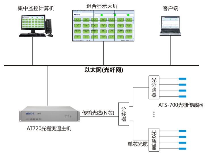AT720光纖光柵溫度傳感系統由AT720光纖光柵測溫主機、ATS-700光柵傳感器和傳輸光纜等組成,系統采用并聯(lián)式應用。