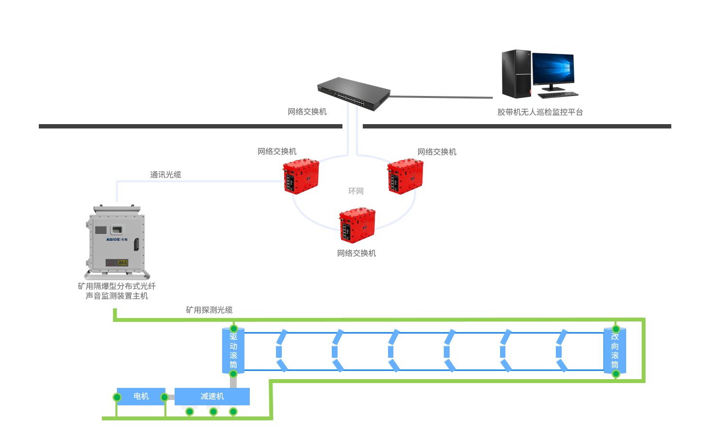 膠帶機振動(dòng)監測系統以分布式光纖振動(dòng)與聲學(xué)傳感技術(shù)為核心,通過(guò)在膠帶機兩側敷設探測光纜,對托輥、驅動(dòng)裝置、轉接料斗等關(guān)鍵設施實(shí)現運行狀態(tài)連續感知與智能診斷,為煤礦行業(yè)無(wú)人化巡檢落地及主動(dòng)安全防控體系構建提供核心技術(shù)支撐。